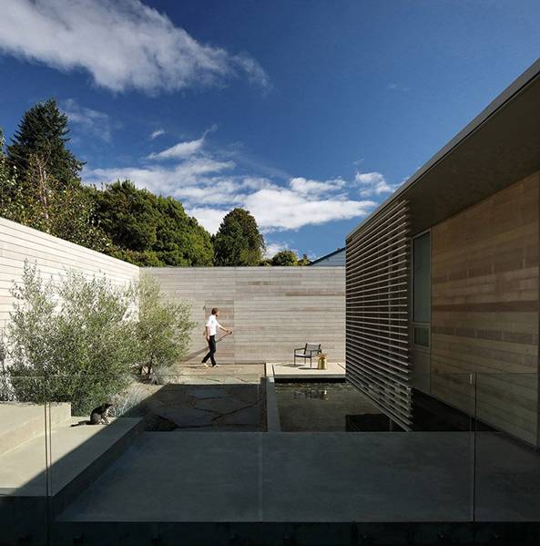 mcleod bovell的设计利用了不同的开放空间,所采用的材料、形式与空间关系都是为了营造出一种令人放松的氛围。房子东南角的滑门打开之后能够使生活空间变大两倍,狭长的地板底是餐厅与厨房的结合,形成了一个独立的狭长空间,以及宽敞的侧院区域,可用于户外烹饪。该设计还专门照顾到客户的需求,热心的房东认为主要的生活空间应与厨房相连,并位于房子的顶层。从前院到阳台一系列的户外空间鼓励客人们直接从外面进入厨房,餐桌与燃木壁炉均可根据天气与客人的数量,通过旋转实现各种各样不同的布置。与房间规模差不多大的池塘与栅栏通过朝南的露天平台与朝北的闭合花园连接在一起,同时与街道相隔实现了私密性。