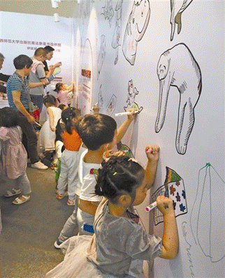孩子们在“色彩宇宙·涂色墙”上涂鸦