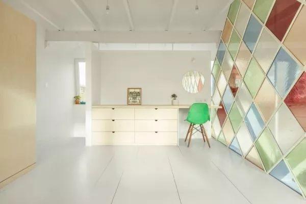 这个办公区域将家的温馨与职业的效率相结合,非常的人性化。整个区域的采光效果非常好,阳光透过彩色玻璃的折射,呈现晶莹剔透的感觉与温暖的色泽,具有了辉煌的宗教神圣感。目前顶层已被辟为模型制作室和会议室,并有屋顶露台,但可分别用作主卧和书房。