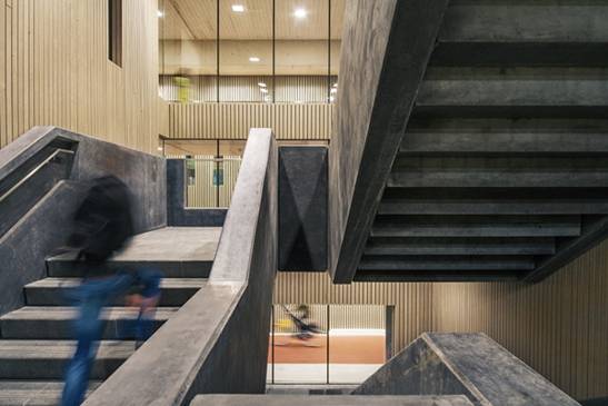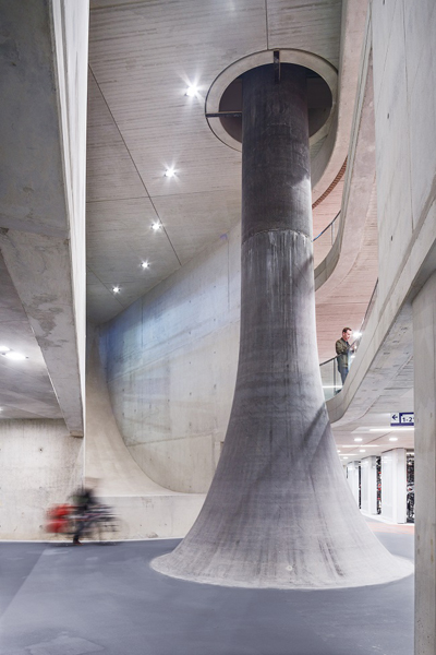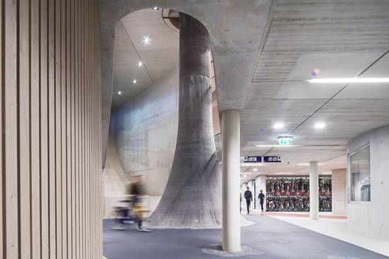车库的设计以便利性、速度和安全性为目标。车库内设置了红色的专用行车道,人们可以从城市一直骑车到车库内的车位旁。通过电子信号提示,你可以清楚地知道哪个区域有剩余车位。