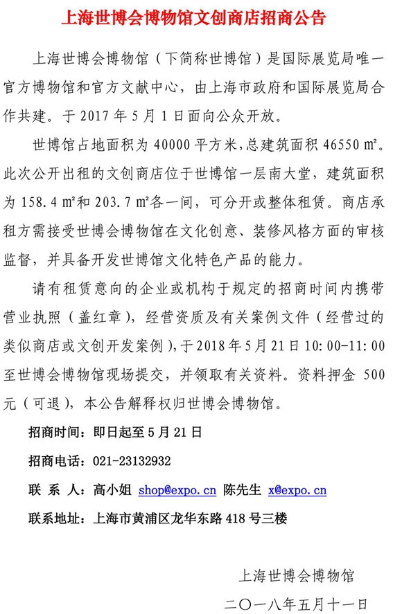 上海世博会博物馆文创商店招商公告