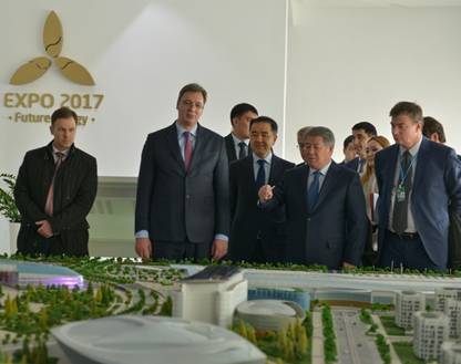 今天,哈萨克斯坦共和国总理巴克特然?萨金塔耶夫陪同塞尔维亚共和国总理亚历山大?武契奇(Aleksandar Vu?i?)访问了2017年阿斯塔纳世博会组织办公室。