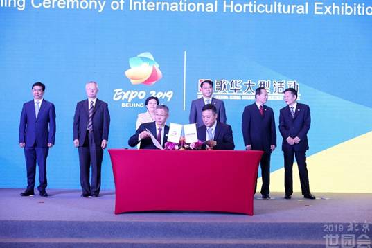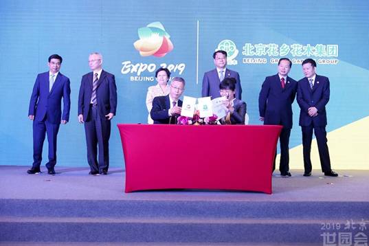 北京市人民政府副市长王红,中国贸促会副会长张伟,中国花卉协会副会长吴晓松,2019北京世园会政府总代表王锦珍,国家林业和草原局造林司副司长陈建武,北京市园林绿化局局长、北京世园局党组书记邓乃平,中国花卉协会副秘书长张引潮,副秘书长彭红明等领导出席签约活动。北京世园局常务副局长周剑平代表北京世园局与赞助企业签订了合作协议。