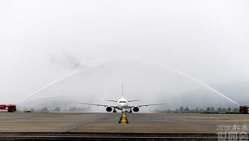 为庆祝“花开盛世号”首航成功,举行了传统的“飞机过水门”欢迎仪式。云南是我国少数民族最多的省份,25个少数民族汇聚成绚烂多彩的文化,傣族泼水节就是云南特有的节日,节日期间人们相互泼水,表示祝福,希望用圣洁的水冲走疾病和灾难,换来美好幸福的生活。欢迎仪式上,两辆大型消防车,从飞机两侧向飞机上空,喷出高达的几十米的“水门”,象征着吉祥、幸福、健康的一朵朵水花在空中盛开,“花开盛世号”缓缓通行,接受“水门”的洗礼,人群爆发出持久热烈的掌声,期待这架满载园艺情怀的主题航班能展翅翱翔,搭载着2019北京世园会的讯息飞往世界的各个角落。身着云南少数民族服饰的青年向出席领导及航班机组人员献上盛放的鲜花花环,代表云南人民向2019北京世园会传递美好祝愿。