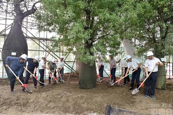 随后,周剑平、武岗、张兰年、吴世江、丁长峰、王辉、赵世伟和王金满共同为首批温室植物栽植垫土。首批在植物馆温室栽种的植物共有7株,有秀色照人的大腹木棉、最高龄的瓶杆树和形态优雅的莲雾,胸径超1.5米的弥勒树最引人注意。未来,将有更多种类的热带植物相继落户,值得期待!
