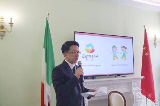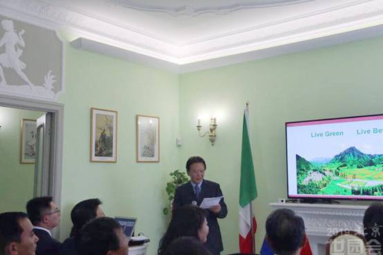 中国驻米兰总领事馆经商室参赞李少峰代表中国驻米兰总领事宋雪峰欢迎中方代表团,并表示希望意大利各方到中国北京,利用世园会这一国际平台向全世界展示意大利的特色和美丽。