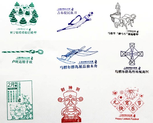 除上述2枚节庆章和月章1枚外,2月份的展品系列章共有6枚,分别是贝宁馆塔塔松巴模型章、吉布提民族刀章、马德里“驷马车”微缩雕塑章、卢旺达馆手杖章、马绍尔群岛展品独木舟章和马绍尔群岛竹枝航海图章。