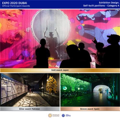 根据展馆的规模和类型,官方参展者奖分为五个不同的类别,从三个方面对展馆进行评定:建筑和景观(仅适用于自建馆)、展览设计、主题演绎。在迪拜世博会园区朱比利公园举行的颁奖典礼上,共颁发了51个金、银、铜奖项。