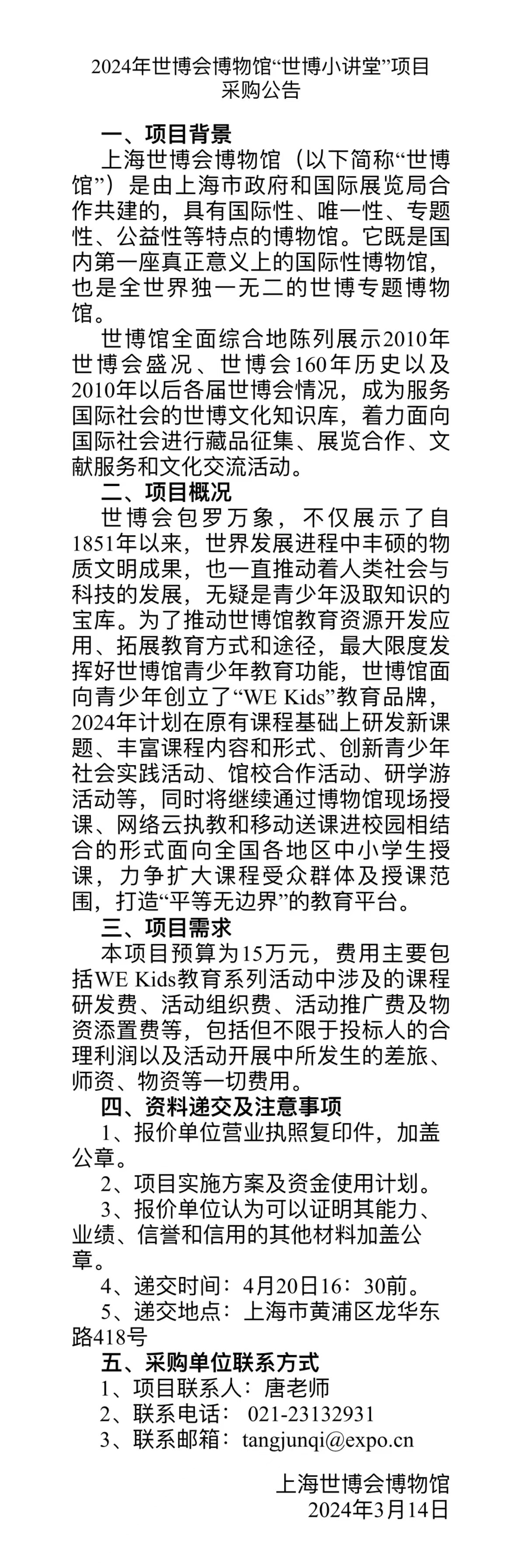2024年世博会博物馆“世博小讲堂”项目采购公告