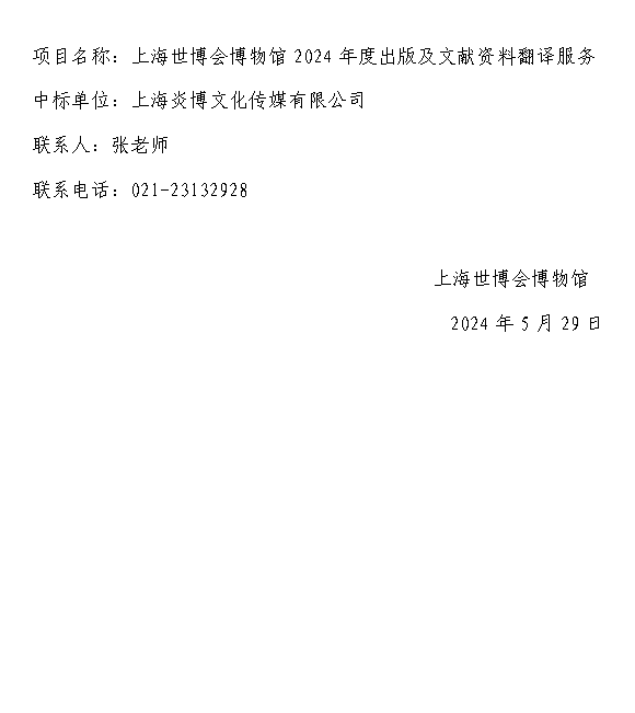 上海世博会博物馆2024年度出版及文献资料翻译服务中标公告