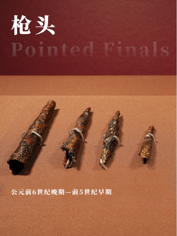 这是两个金属锤制而成的石头,带有插杆的插槽。这种枪头可能用于标枪或者长矛,标枪偏轻而长矛偏重,皆为步兵使用。
