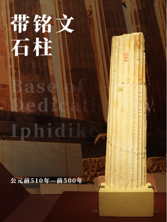 这是一根充当供奉品底座的伊奥尼式柱,在它上面放置的可能是一座胜利女神尼姬雕像或女子立像。在石柱的凹槽之间,用伊奥尼亚和阿提卡式字母混合写着一段两行的铭文。铭文是由一位试图模仿阿卡提式字母的希俄斯岛人刻的。