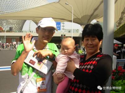 记得当时世博园区的人真的是太多了,还好我们遇到一位“小白菜”,我们向他询问母婴馆和休息处的地方。他微微一笑,指着不远处耐心而细致地跟我们指引着,看样子他做这种指引已经无数次了。这位小白菜看起来跟我侄子年纪一般大,我们提出想和他合影的想法,他腼腆的笑了笑说好的。于是就有了这张小白菜哥哥和我们的合照。