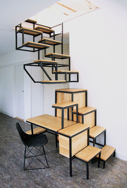 受设计师 Just Haasnoot 委托,荷兰 Mieke Meijer 设计工作室设计了一个多功能悬空楼梯,说是楼梯,但是整合了桌子、搁架、柜子、台阶等多种功能,并且楼梯的中间位置是分开的,仿佛悬空。
