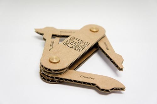 Anthony Cole用瓦楞纸制作的瑞士军刀名片,并把自己的专长印在每把纸片工具上面,当你把玩它的时候,也能对名片主人建立起深刻的印象。