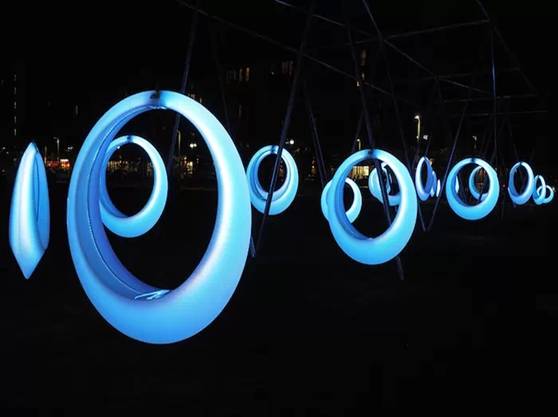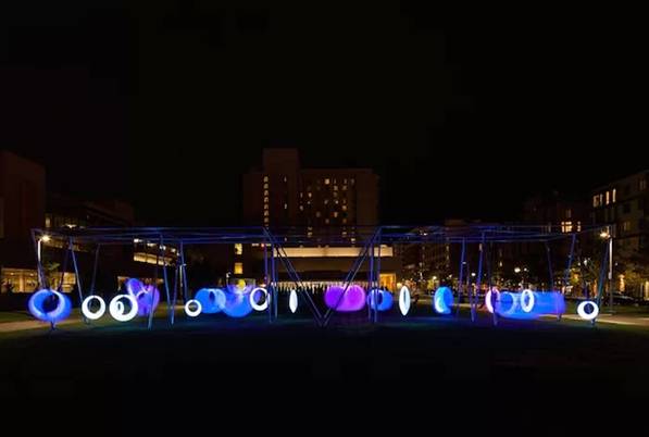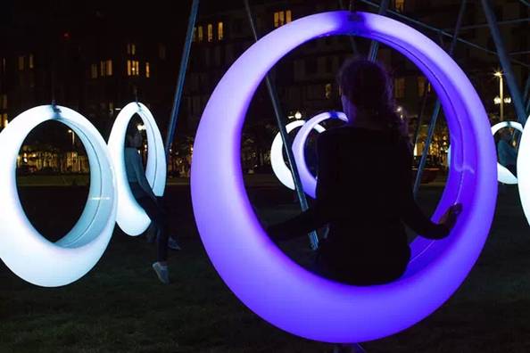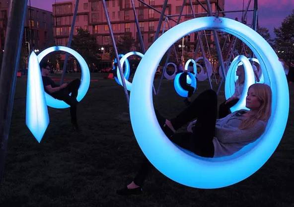 在波士顿的一个公园,出现了20 架像甜甜圈一样的环形 LED 秋千 Swing Time,每当进入夜晚,秋千便发出梦幻的光芒,同时随着使用者的摇晃,变换不同的颜色。它由Höweler + Yoon 建筑事务所设计,利用秋千内置的加速度计监测摆动力度的变化,控制光源由红到紫。