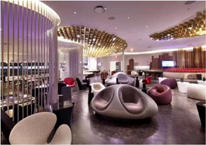 休息室中央是云形的鸡尾酒吧,被不锈钢条河胡桃木片组成的弯曲墙壁包围。整个休息室气氛独特,为旅客带来非凡的享受,留下深刻印象。