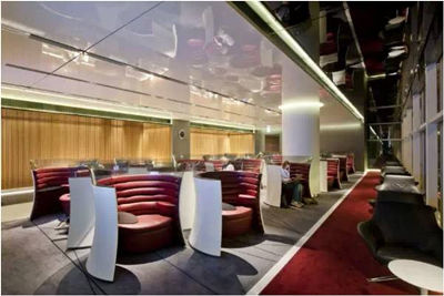 Foster + Partners倾力之作,采用最优质的彩盒和座椅系统,有接待区、酒吧和休闲区。线性排列的红色地毯,分隔了空间。