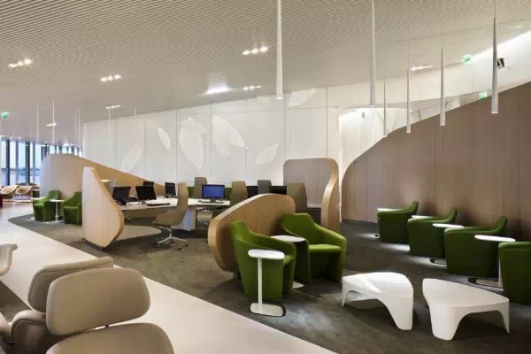 其内部装饰和色调大部分是从现代公园的相应元素中提取的,树木和叶子的形状加上木制结构使这种特色得到了加强。棕色和米色的物体在绿色的映衬下更显高雅,走道也具有植物的特征。整个休息室给人以端庄谦逊的感觉,为旅客提供良好的隐秘环境。