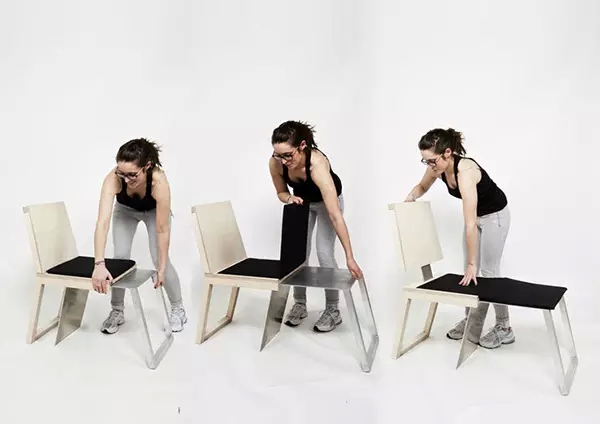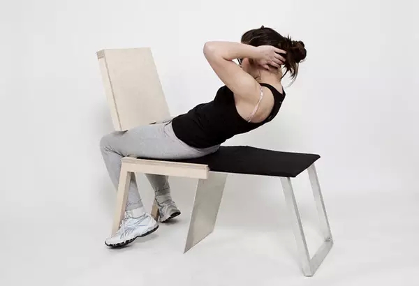 2 Fit 由两个模块组成,木质的椅背、坐垫和两个后腿组成其中一个模块,剩下的部分是由金属制成的第二个模块。办公的时候它就是一个普通的椅子,但想要运动时,只需把第二模块向外拉出,铺上垫子,再把椅背拉升,就可以做简单的仰卧起坐等简单的腰部运动。