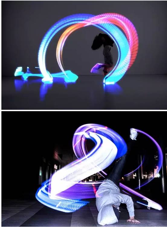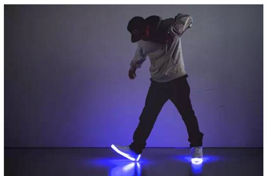 这款运动鞋可能会成为街舞或者行为艺术爱好者的宠儿,因为它会根据用户的动作以及他们所在的不同环境下展现出不同的色彩和声音,甚至可以与用户进行互动。而且当鞋在低光条件下,用长时间曝光的相机可以捕捉到用户旋转时的运动轨迹,很是惊艳。