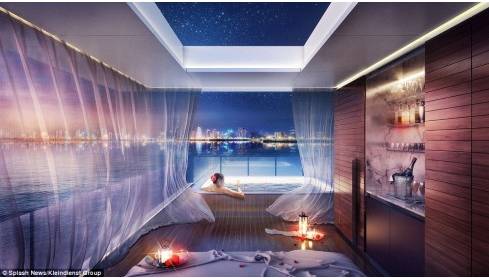 来自Kleindienst Group公司一个美妙得如同天方夜谭的计划,他们打算在阿拉伯湾上建造这些真正的豪宅——近似地,你可以把它们看作是没有动力单元的豪华游艇,但却比游艇更加休闲和环保,也更加私密。每一幢都分为水上和水下两个部分,其中水上部分提供三层甲板,方便朋友们正着晒、反着晒、横着晒、竖着晒,晒完还有按摩浴缸伺候。而室内则提供有豪华的厨房和餐厅,以及一个迷你酒吧。水下部分相对私密,是豪宅主人的卧室,拥有透明的玻璃幕墙,这才是真正的私享海景。