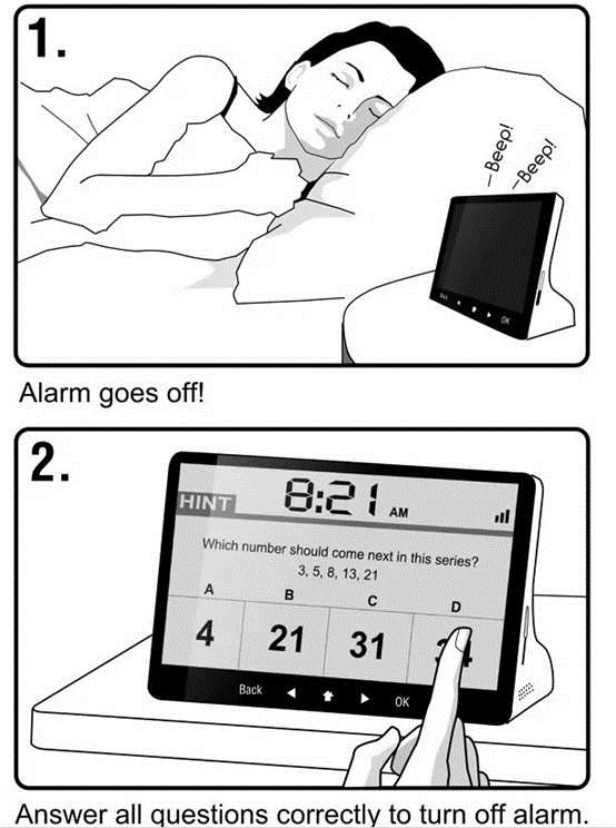 还在为早上总是晚起、上班迟到烦恼并怨恨闹钟如此不经用,一拍就停吗?也许你该试试设计师Oliver Sha的智商闹钟( IQ Alarm clock),每天早晨给自己来一场头脑风暴。使用智商闹钟,接下来每天清晨等待你的将会是1到3个各类难题,贪睡者必须在该死的闹铃声骚扰中正确的回答题目才能把闹钟关闭,题目可以在之前自行设定,比如给贪睡的情侣设定问题“我们第一次牵手是在何年何月何日”,还在睡梦中?赶紧偷偷地查查备忘录吧!