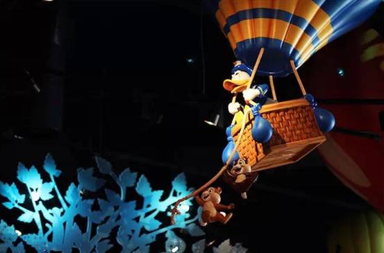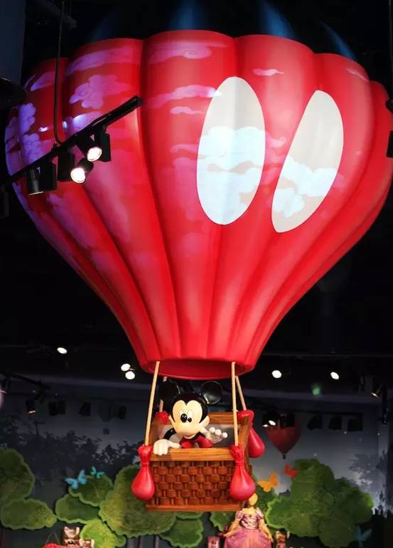 抬头看,米奇、米妮、高飞、唐老鸭、黛丝、布鲁托,以及钢牙奇奇和大鼻蒂蒂正在热气球上向你打招呼,还有动态的“云彩”漂浮其间。