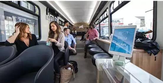 瞄准了使用公共交通、同时又有更高要求的职业人士 ,来自旧金山的Leap在传统的公交车上做了重新设计,推出了一种拥有全新体验的通勤公交。相比于普通的市内公交,它看起来更像一个休闲咖啡馆,这里提供有的WiFi网络、充足的USB充电接口、笔记本工作台、群聊角和更豪华的座位,甚至是小吃、饮品。