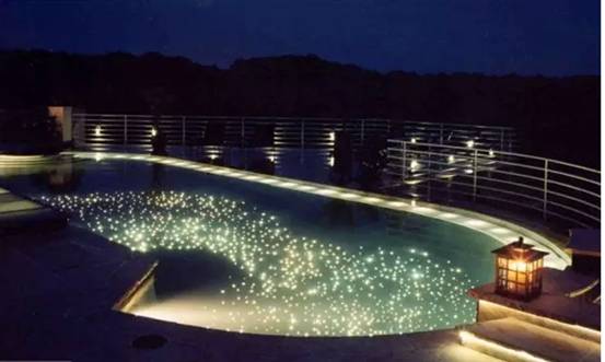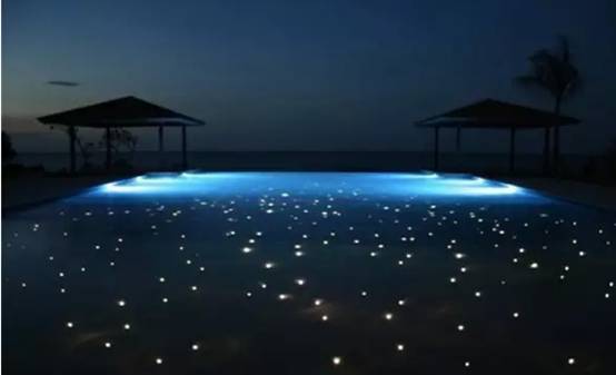 某家LED和光纤照明公司把LED延伸到游泳池中,带来了LED水底灯。这些独特的LED灯可以定制设计与安装在游泳池底部,并可通过无线控制器来控制灯光明暗或闪烁,在夜空下将游泳池点缀出繁星点点的美丽效果,置身其中就仿佛正畅游于灿烂的银河之上。