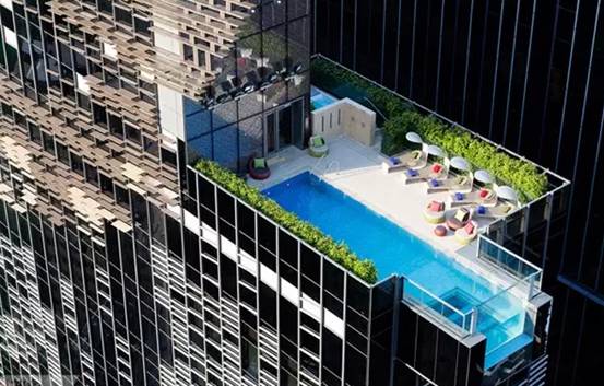 没错,这就是一个悬空的游泳池!建筑团队Aedas在设计这栋旅馆时,加入了这个尾端透明的泳池元素,让Hotel Indigo在众多精品旅馆之中瞬间脱颖而出。不过就算你爱游泳,想要体验这样的高空绿洲,还得没有惧高症才行,不然游到尾端看到底下的车水马龙,瞬间晕厥可不是件有趣的事呢。