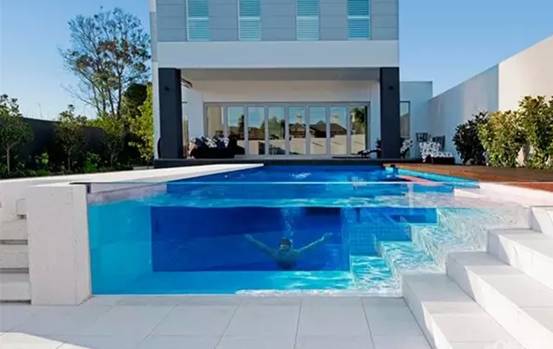 透明游泳池位于澳大利墨尔本的一个私宅。其实在外观形状上,透明泳池并不比普通泳池高明,但是在聪明的设计师把泳池两端常用的砖墙替换成透明的防碎玻璃后、整个泳池的档次就立马提升,显得更精致更美丽。