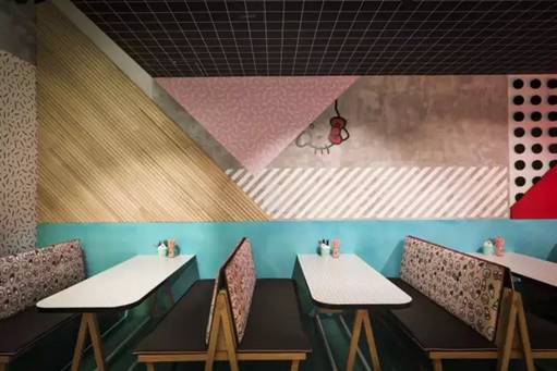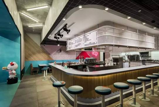 当然,除了以上这些,作为Hello Kitty餐厅,它必须带有品牌辨识度,Hello Kitty的形象还是出现在餐厅的各个地方,只不过没有密集地对顾客进行视觉轰炸。除了入口处摆着一个完整的Hello Kitty人偶之外,混凝土墙壁和墙面装饰上也有它的头像。另外就是一些小细节,比如餐具、壁纸和沙发套上印着食物的卡通图案,每张深绿色吧台椅的椅面上小蝴蝶结或猫的胡子……经典的Hello Kitty店少不了这些精细的点缀。