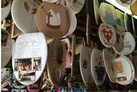 顾名思义,这个博物馆里面所有的艺术品都是以马桶盖为载体创作的。博物馆的主人是已经90多岁的巴尼·史密斯,退休前史密斯是一名水管工,他一直都非常喜欢马桶盖,而且因为职业关系他和马桶供应商联系也很密切,经常能够拿到免费的马桶盖,于是他就在这些盖子上开始了自己的创作生涯。从1970年代初至今他的作品已经超过1000件了!其中既有历史、新闻事件,也有迈克尔杰克逊的舞姿,如今史密斯还在继续创作这些马桶盖艺术品!