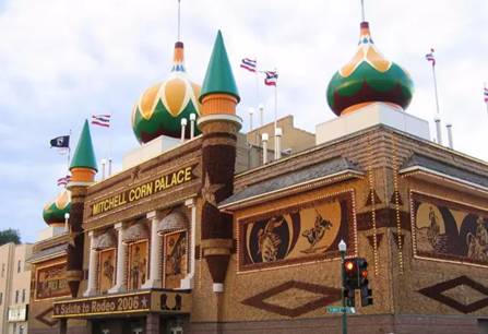 位于美国西北部南达科他州的玉米宫绝对是世界上独一无二的宫殿,宫殿外有一个可爱的玉米先生,宫殿里的高墙四壁也有玉米粒精心拼制成的图案,还有一幅的图案是南达科他州地标性建筑之一的"总统山"。这个始建于1892年的宫殿当初是为了能让人们发现这个人口只有一万多人的小镇才建造的,后来因为风格太有创意了,所以现在每年都能吸引几十万的游客前来参观。