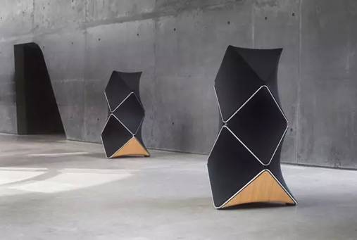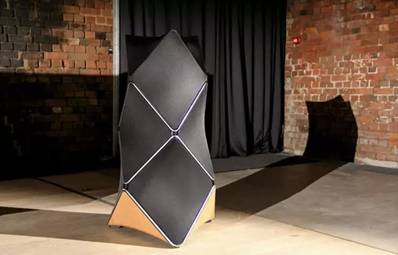 从造型来看,BeoLab 90突破了传统音响的箱式造型,采用了三角锥形设计,搭配弧形木质材料、黑色针织物及铝制金属,充满了抽象的艺术气息。