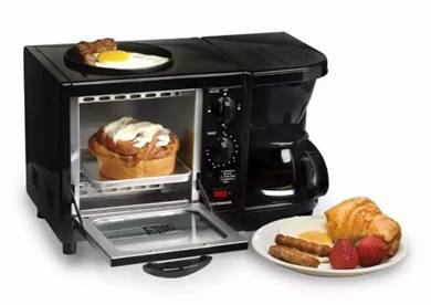 包括四杯容量的咖啡机,小型烤箱,还有一个可以煎蛋煎烤肠的煎盘。三合一的功能组合可以轻松搞定一份香喷喷的美式早餐。一杯咖啡,一个马芬,一份煎蛋配烤肠,再搭配个水果,十五分钟就能搞定。
