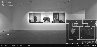 在“今日数字美术馆”副总经理赵龙平的介绍下,记者打开网站中“全景展示”栏目,该栏目既包括今日美术馆本馆的展览,也包括国内及国际上的知名展览。在2013年第55届威尼斯双年展平行展——“幻真的宇宙”全景页面,通过缓慢的画面移动,观众能看到展厅入口的全景图像,并能通过点击导引标记在馆内自由“行走”。同时,可以通过屏幕下方向左、向右、向上、向下等按钮随意调整视角;屏幕右下方还有可放大的参观地图,能够清晰显示当前所在位置及所有展品的方位。