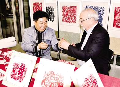 中国剪纸国家级代表性传承人、著名剪纸艺术大师段建珺为来宾进行了现场演示,“内蒙古剪纸太神奇了”、“中国的文化了不起”,精彩的剪纸技艺换来了在场观众的啧啧赞叹和阵阵掌声。段建珺还应邀为库尔布瓦市市长雅克·库索乌斯基剪了生肖龙,不到三分钟,一条灵动神活的中国龙便跃然手中,并且手把手教授这位市长学习和林格尔剪纸技艺。据悉,此次展出的30余幅和林格尔剪纸是法国·中国内蒙古文化周活动中内蒙古剪纸展的重要内容,涵盖了段建珺、张花女、康枝儿、高粉梅等享誉海内外的剪纸名家作品。