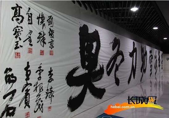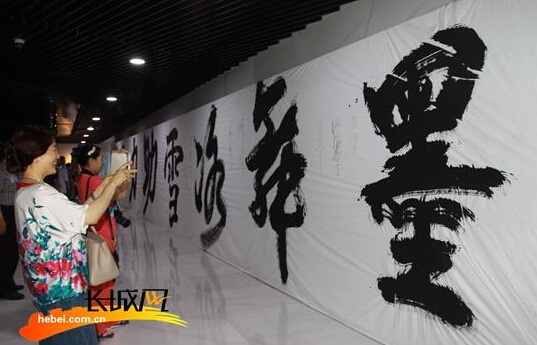 巨幅书法作品占了一面墙,参观的人在作品前或者徘徊观摩,或者拍照留念;记者凑到作品前,一股墨香扑面而来。