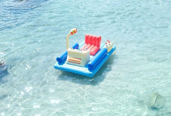 其中主打的应该是下面这个“时光穿梭浮床“——还原了哆啦A梦里的“时光机”。带它到海水边,悠闲躺在上面吹吹海风,晒太阳,绝对赚足别人艳羡的目光。