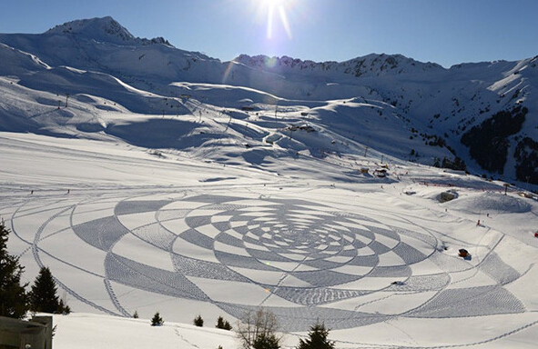 凛冬已至,自诩为世界第一“雪地艺术家”的Simon Beck又带着他的最新雪地作品回归了。