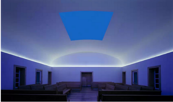 以作品“Skyspace”为例。这是一个足够容纳15人的空间,观者坐在边缘的长凳上,观看空间中唯一的天窗。特瑞尔以光线投射手法来创造出看似具有质量和重量的形状,但其实这些形状只是光线的投射。