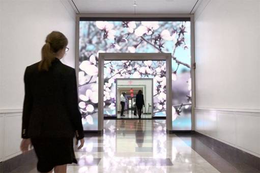 在播放“季节”这个主题时,媒体墙会展览华盛顿的标志性樱桃树的生长历程。在“春季”阶段,这些樱桃树会发芽,也会有花瓣悄然落下,当人们停在大厅时,蝴蝶会在屏幕中上下飞舞。“色彩秀”则展示了多种彩色线条在墙上扩散,如同织起一幅巨大的挂毯。“街景”则展示了华盛顿的标志性建筑,雕塑和交通运行的场面。