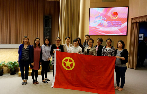 世博馆团员与党总支书记蒋莎(右四)一起参加团日表彰分享活动