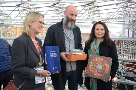 米兰时间2015年10月29日,米兰世博会英国馆向世博会博物馆捐赠展品,英国馆馆长Sara Everett,英国馆建筑设计师Wolfgang Buttres,米兰世博会博物馆展馆总代表刘绣华出席捐赠仪式。本次英国馆捐赠品为铝制英国馆“蜂巢”剖面模型。