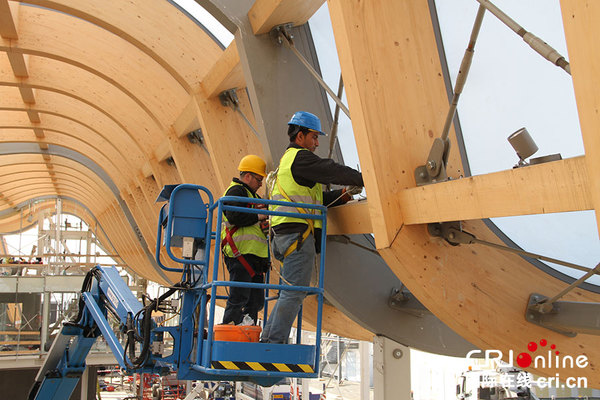 本届米兰世博会中国国家馆由清华大学设计,施工由一个中意合作的团队负责,异地建馆是一个最大的挑战。负责中国馆建筑设计的主持建筑师陆轶辰介绍说:“这个项目对我们来说最大的挑战是在异地建一个中国馆,通过中国的设计在意大利实施。项目从一开始就是往下扛,一直扛到现在,不过整个效果我们还是满意的。意方的施工质量、专业程度和工人的专业性我们觉得都非常好。像你们看到的呈现出来的木头屋面,其实每处都有特殊的节点,我们花费了非常多的时间和意方一起沟通,对每个节点透彻地研究,最后实施到这样一个程度,整体还是满意的。”