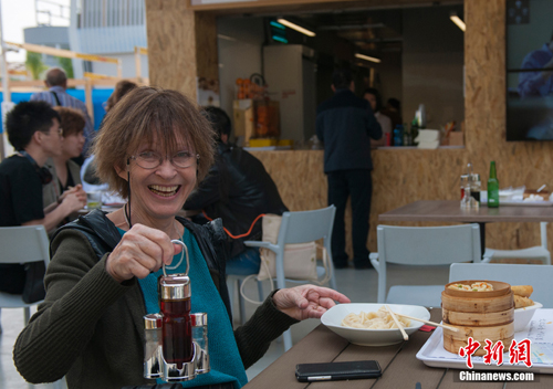 这名游客点了饺子、烧麦以及春卷,并向记者展示手里的辣椒油。 (中新网记者 李卿 摄)