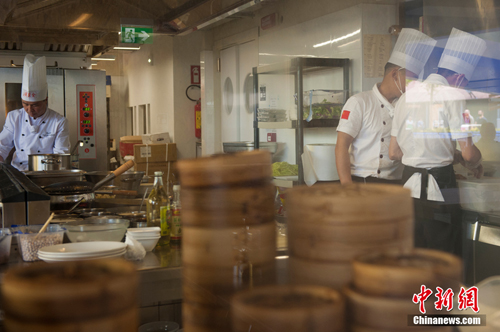 馆内游客拍照忙,馆外中餐厅的厨师们也忙着做菜,以满足大批食客的需求。 中新网记者 李卿 摄
