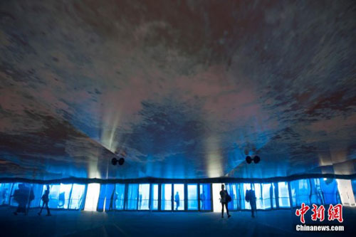 图为2015米兰世博会——威尼斯水馆入口处,天花板上投射出水流动的画面,十分逼真。 中新网记者 李卿 摄